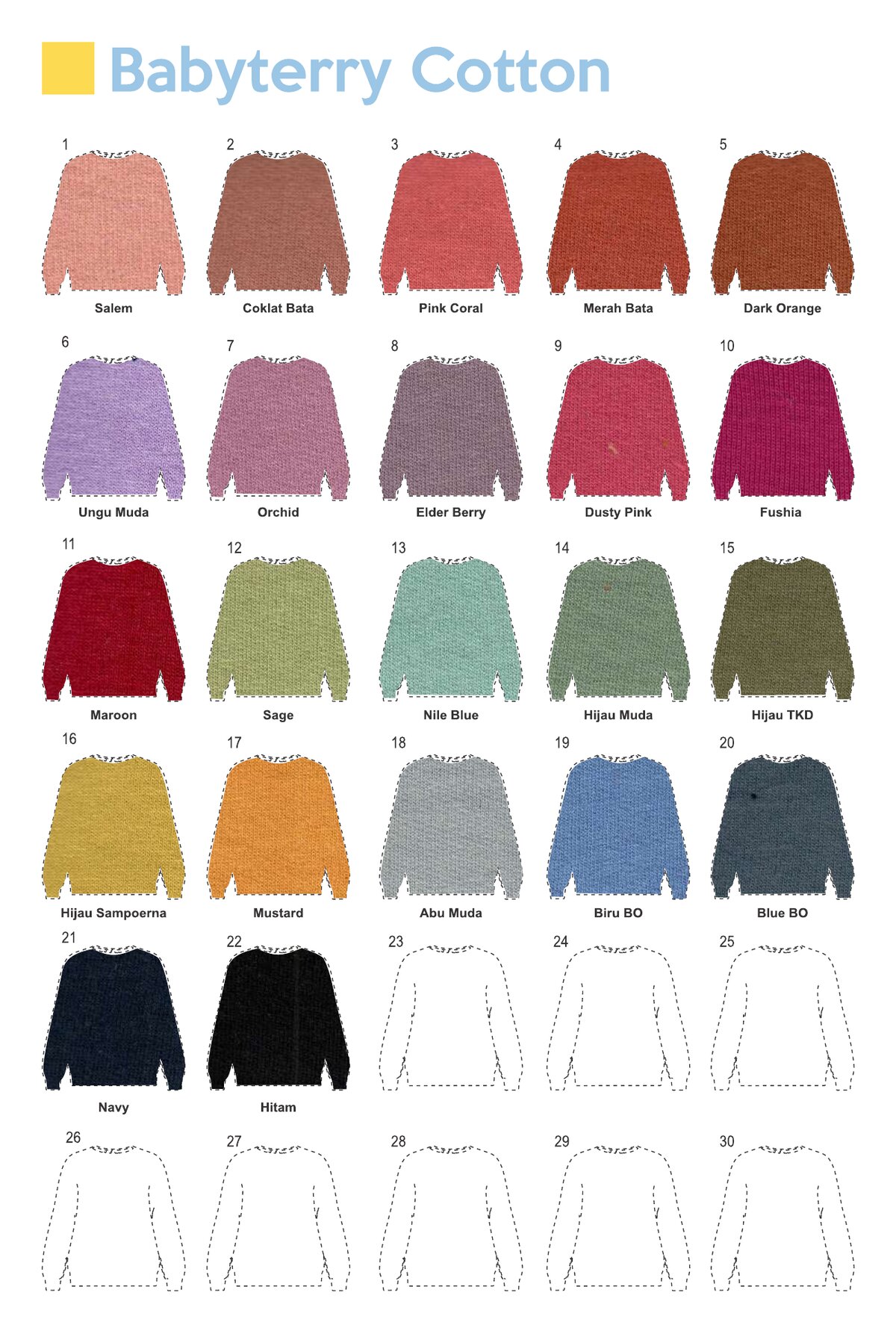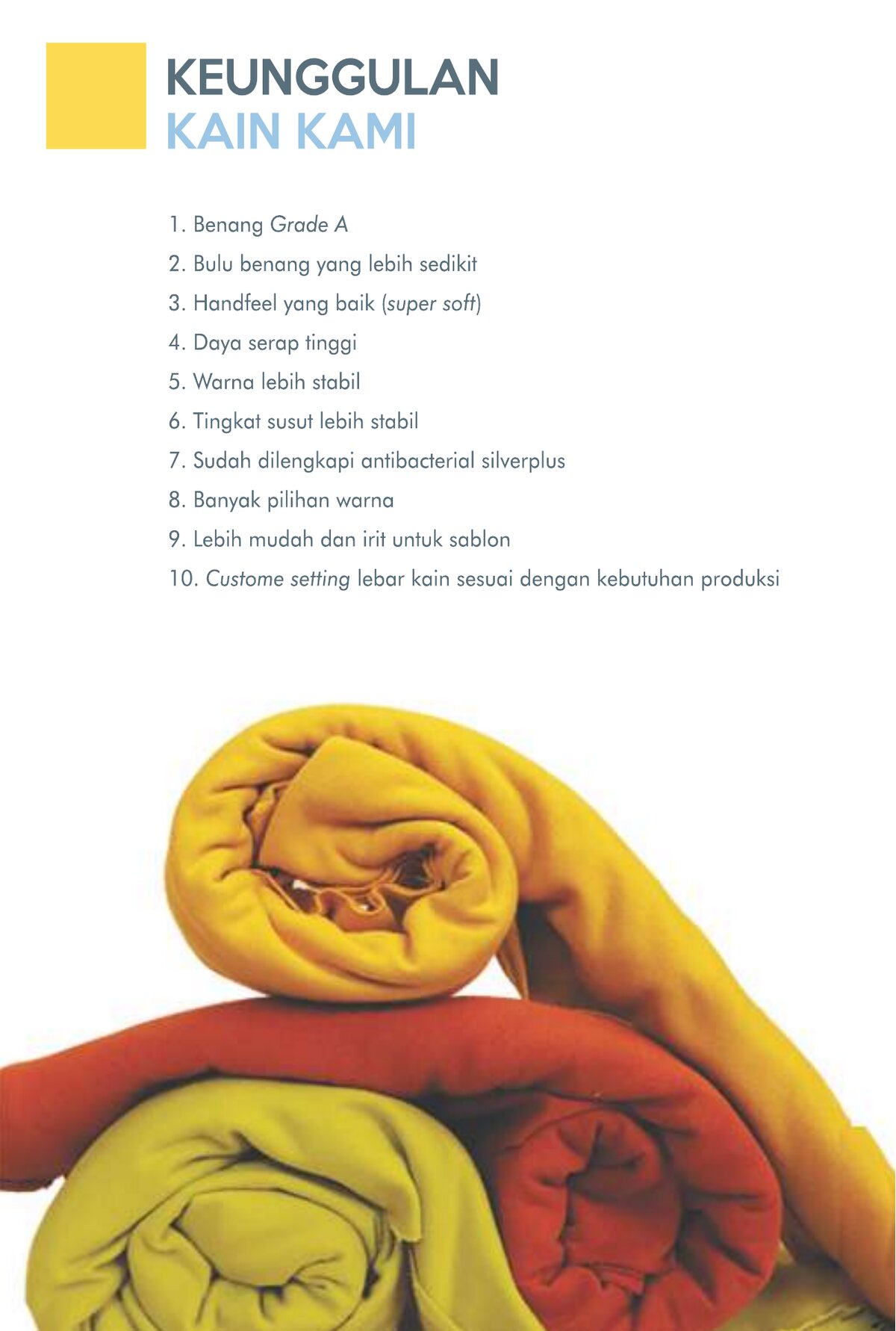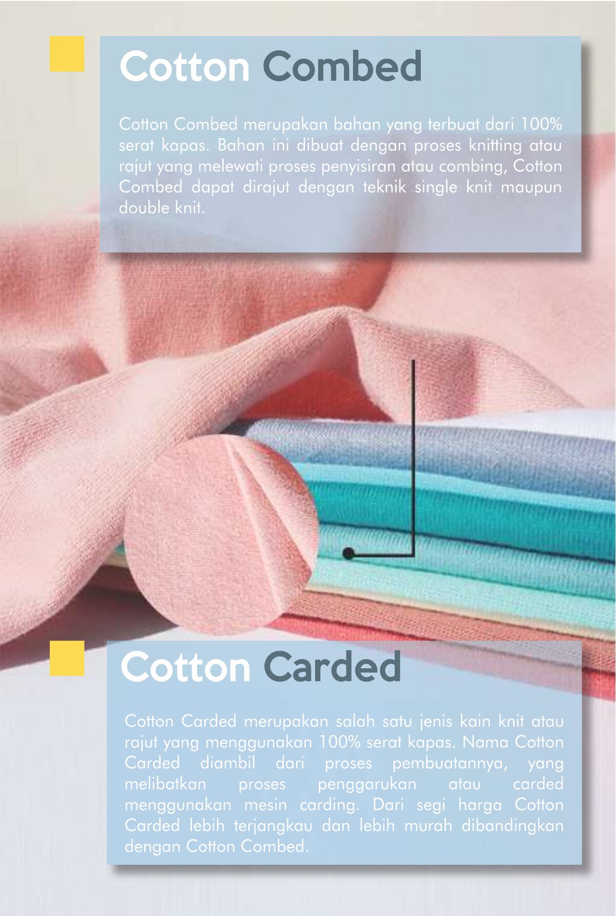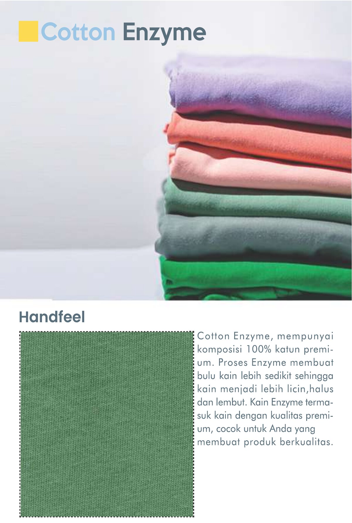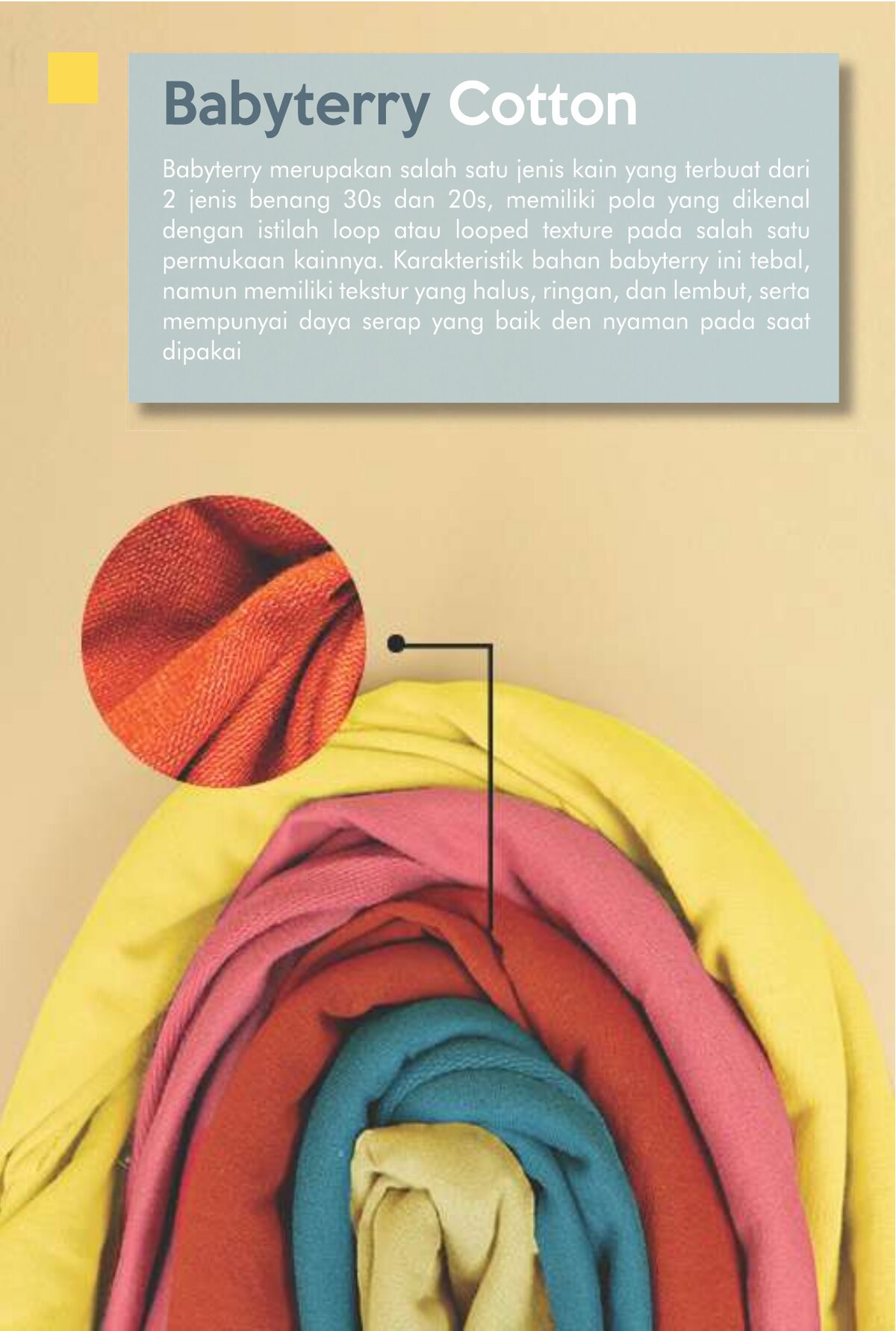 Babyterry dengan komposisi Tetoron Cotton (TC). Lebih dominan polyester sehingga lebih ekonomis dan tidak mudah menyusut.